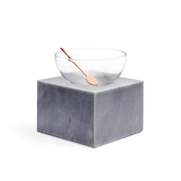 “Half Moon” caviar bowl in transparent borosilicate glass, mouth‑blown, with base in grigio Versilia marble. Includes copper spoon. Designed by Elisa Ossino. Handmade product.
