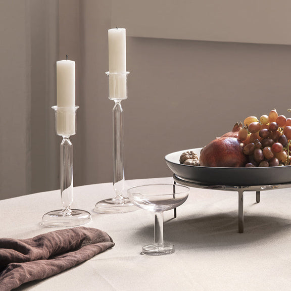 “Luna” candleholders in mouth‑blown glass, designed by Aldo Cibic. A timeless object with a curved silhouette that echoes the archetype of a candelabrum. Handmade.