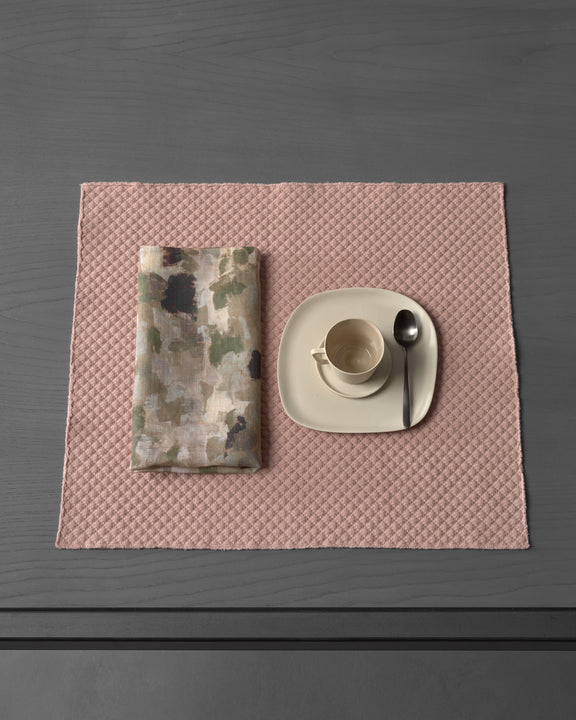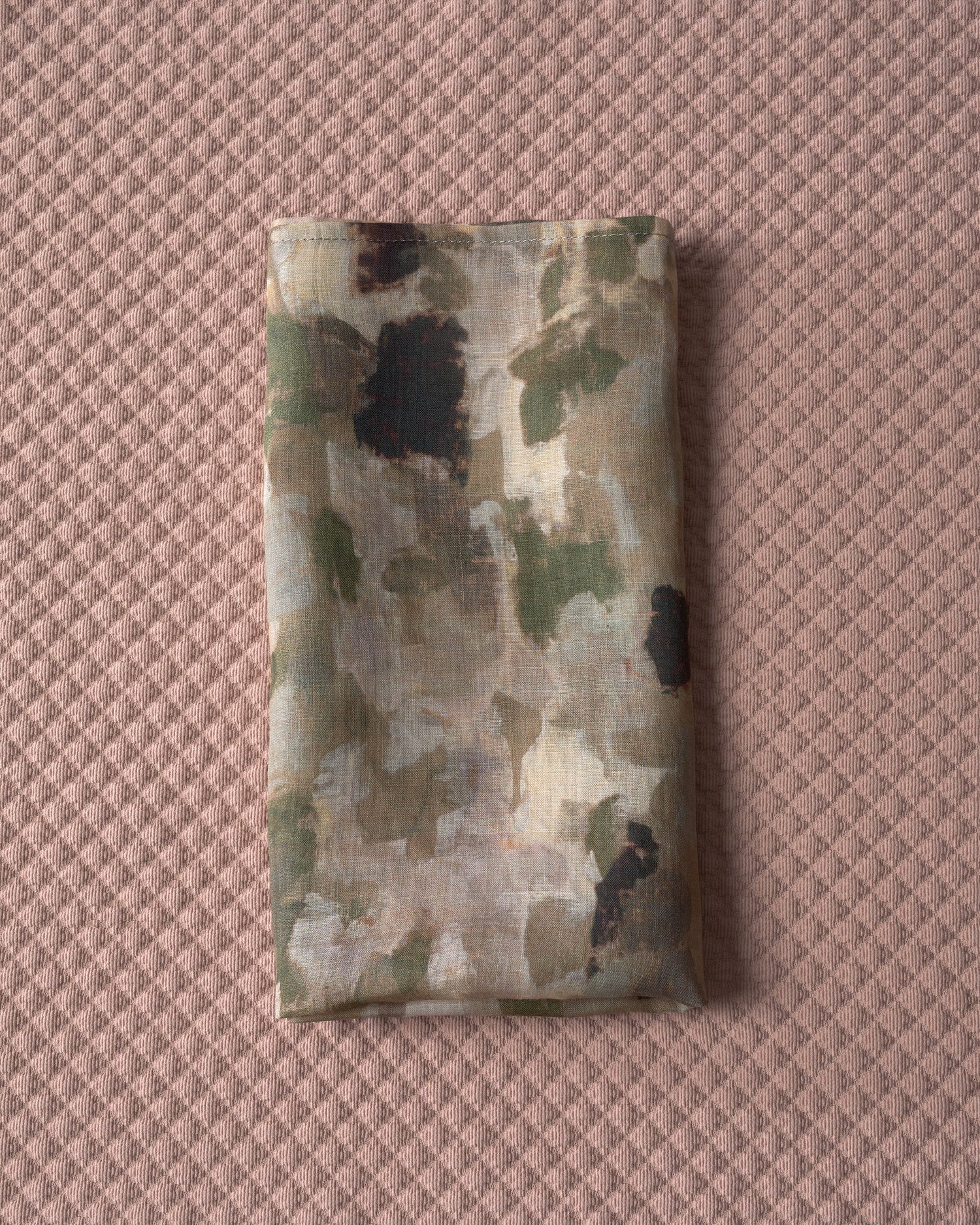 The camouflage style also pervades home textiles, inspiring the pattern of NAP RAP printed napkins. The camouflage pattern, used in fashion, decorates the table in the tones of Malto and Guado: an inspiration that reinterprets an iconic workwear in a contemporary, creative style. Each printed napkin is sold individually.