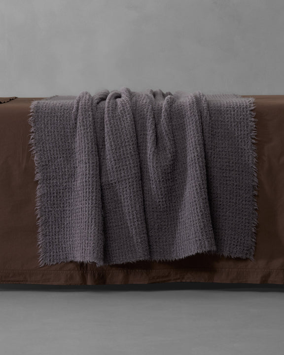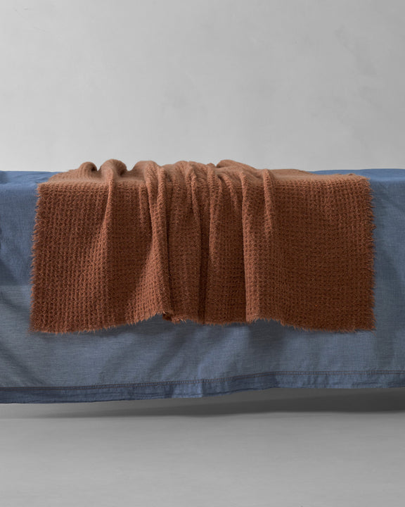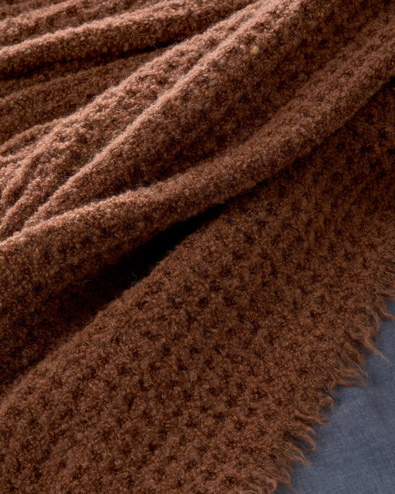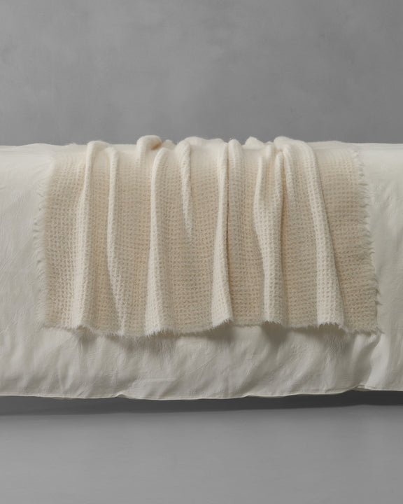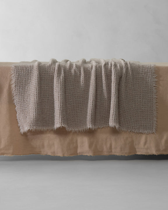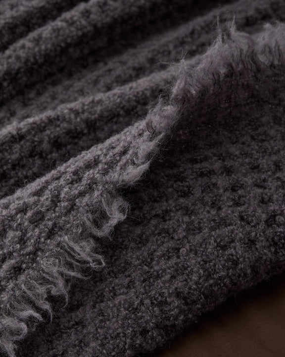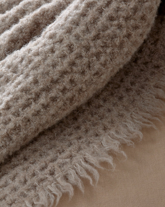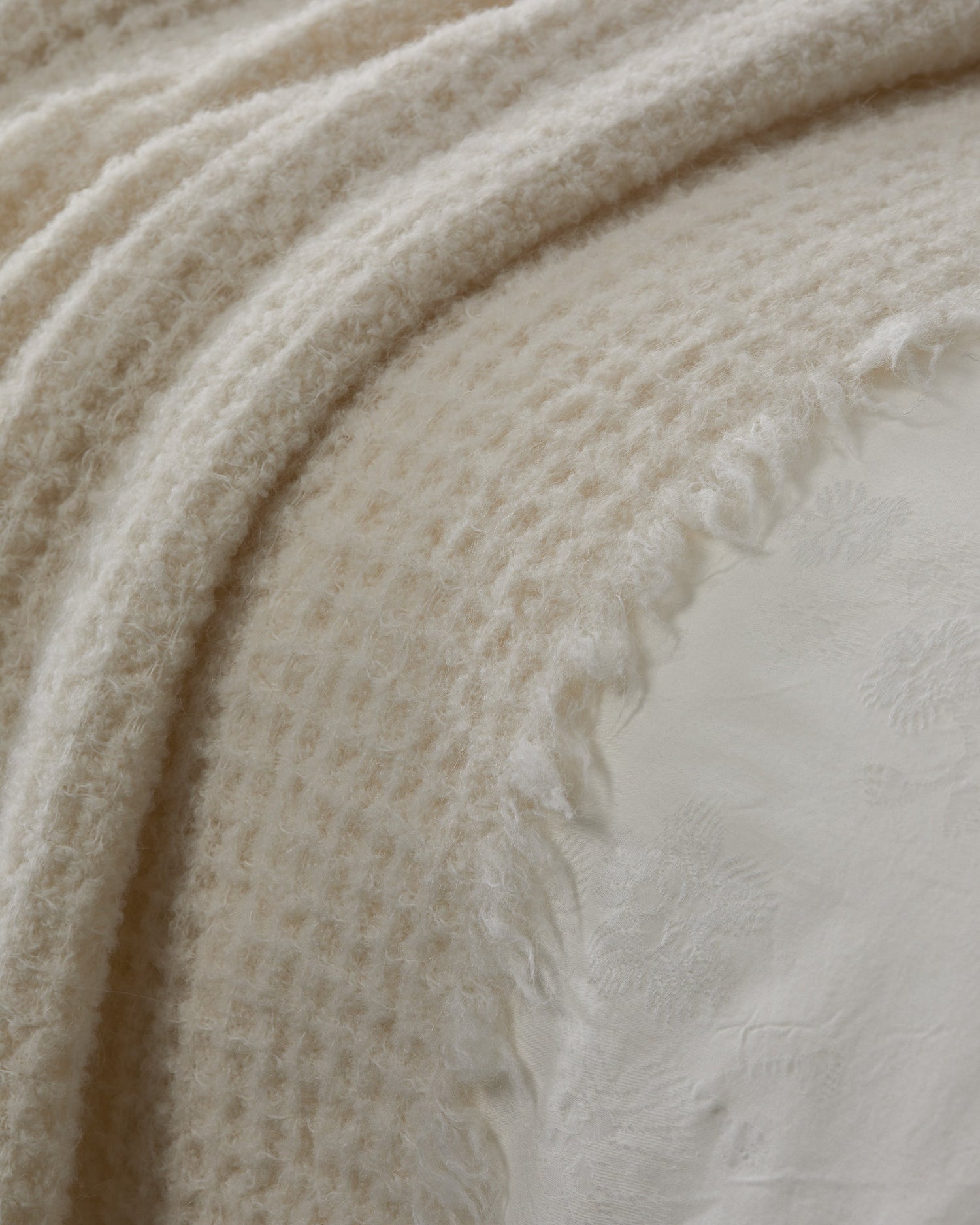 PON is a throw in boucle alpaca, presenting a new interpretation of the iconic waffle weave finishing. Cosy and soft to the touch, it looks unique thanks to the macro embossed tone-on-tone texture. The material, almost impalpable, feels light but still maintains a soft and warm touch.