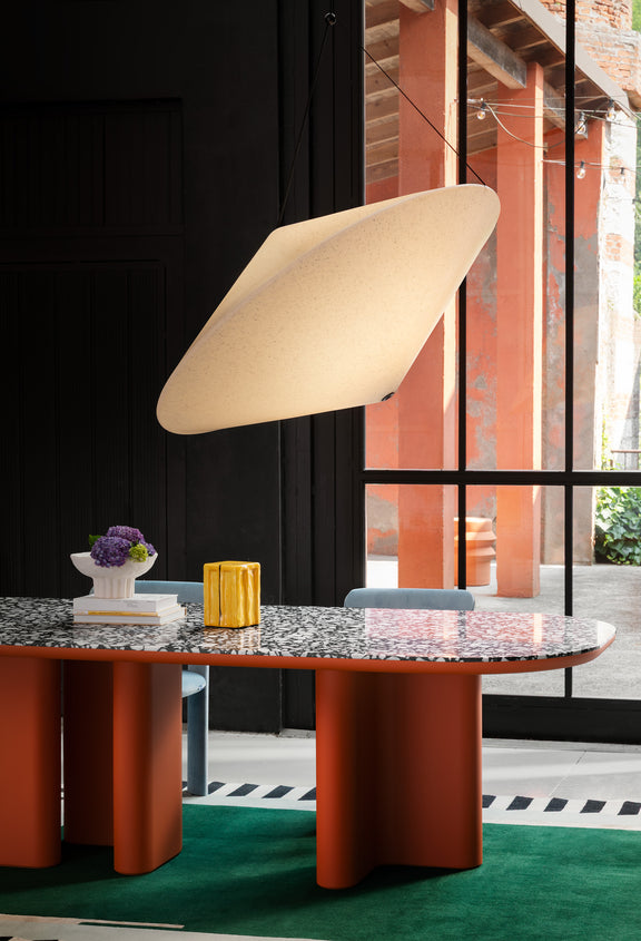Playful and elegant suspension lamp by Miniforms. Rificolona introduces a whimsical presence into interiors: its recycled polyethylene shade hovers delicately and rotates in dialogue with light to create soft, dynamic lighting. Inspired by traditional lanterns, it transforms illumination into an atmospheric design statement, ideal for refined residential and contract spaces.