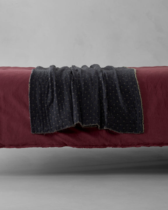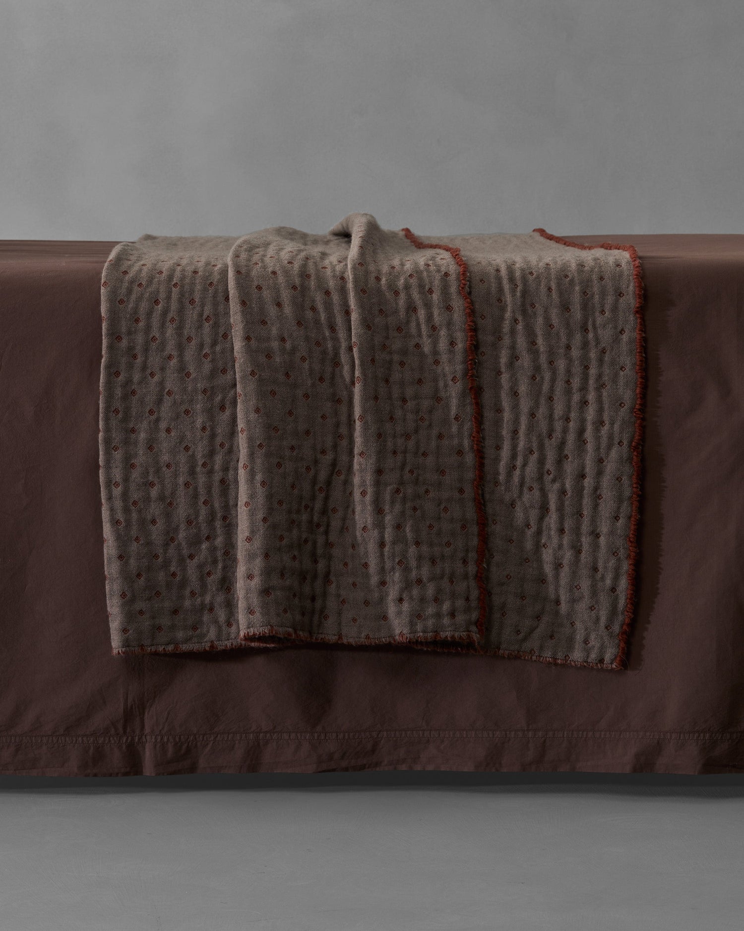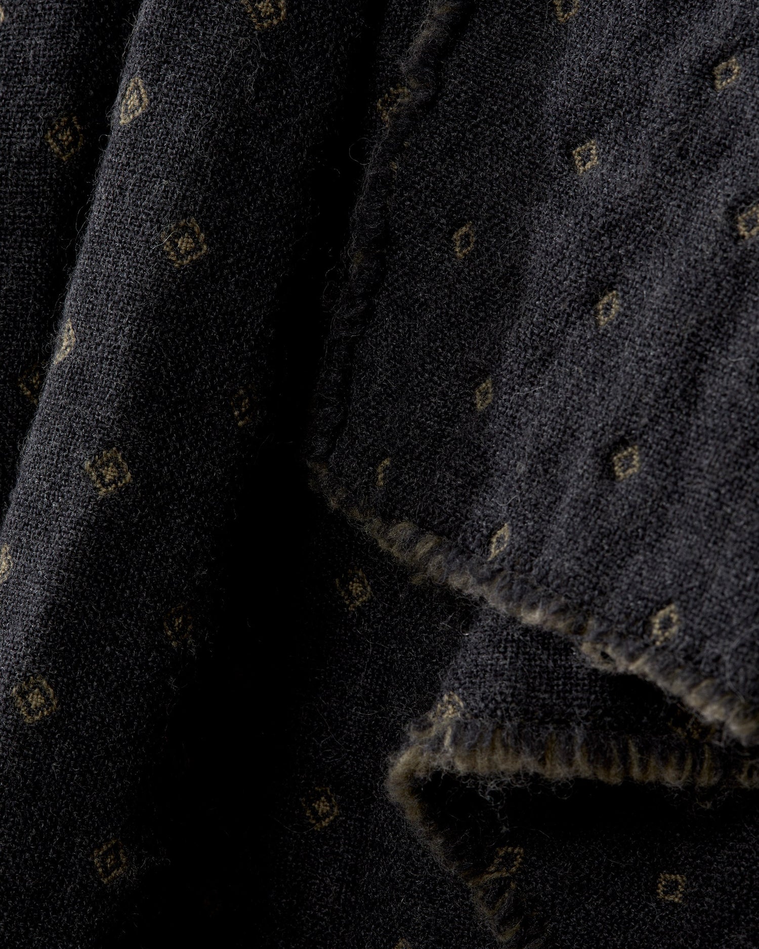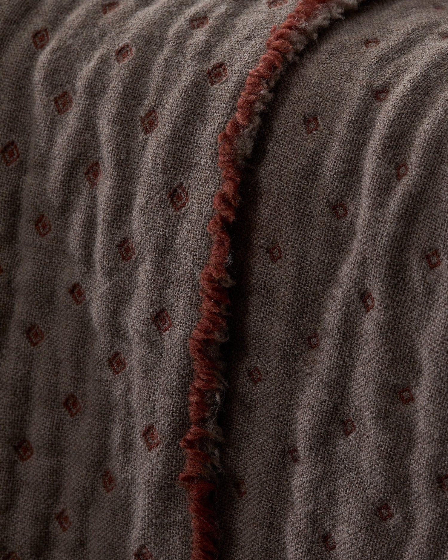 TAI is a throw with a dandy look, geometric and rigorous, with a tailored aesthetics. Made of four layers of pure virgin wool, it is embellished by an exquisite contrasting tie motif that highlights its distinctive character. Soft to the touch and with a textured finishing, TAI adds a touch of discreet elegance to the bedroom.